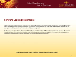 The document provides an overview of Sage Gold Corp., including forward-looking statements and risk factors to consider. It summarizes Sage Gold's corporate vision, structure, properties and projects. Specifically, it outlines plans to develop the Clavos gold mine in Timmins, Ontario, with existing infrastructure and a new resource study. It highlights drill results from 2011 indicating potential to increase resources and notes opportunities for near-term production.