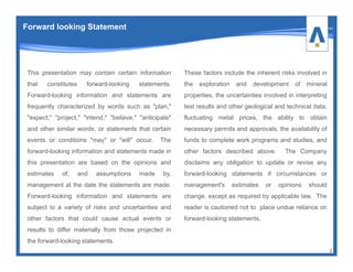 This document provides an overview of the Copper Flat Project owned by THEMAC Resources Group. It summarizes key project details including the well-defined copper reserve of 125 million tons at 0.4% copper equivalent, expected strong and constant production profile of 35,000 tons per year of copper equivalent, and low operating costs of $1.42 per pound of copper which places it near the first quartile of the global cost curve. It also notes the project's low capital intensity of $11,500 per annual ton of capacity due to $65 million in existing infrastructure from previous operations. Permitting for the project is well advanced and expected to be completed in 2015 to allow for commissioning in late 2016.