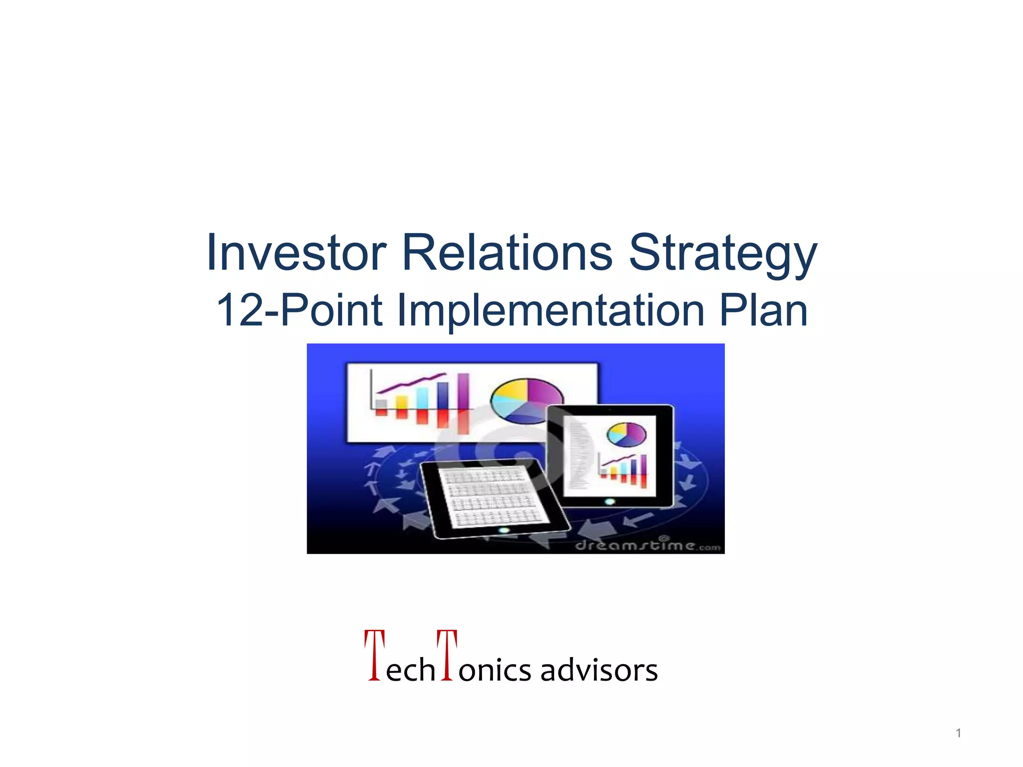 The document outlines a 12-point implementation plan for an investor relations (IR) strategy aimed at effectively communicating a company's story to analysts and investors. Key objectives include creating a consistent narrative, proactive outreach, and providing market intelligence to management. The plan emphasizes the evolving role of IR, requiring comprehensive strategies to engage with the investment community and ensure compliance with regulations.