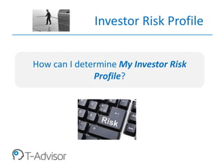 Investor risk profiles determine individual attitudes towards risk in investing, impacting asset allocation decisions. There are five profiles: very conservative, conservative, moderate, dynamic, and aggressive, each with varying levels of risk and expected returns. Understanding one's risk tolerance through simple questions can guide investors in selecting appropriate investment strategies.