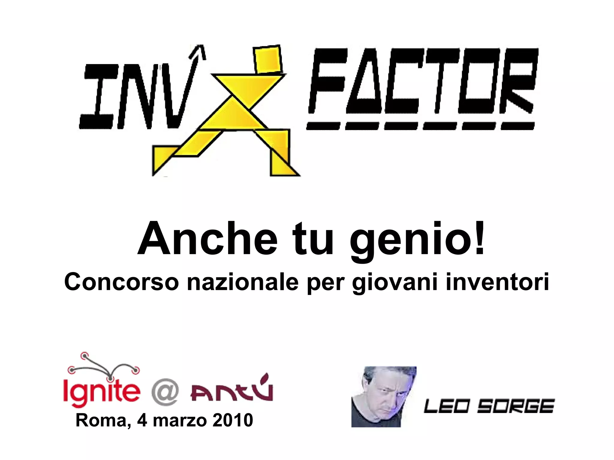Il documento descrive il concorso nazionale 'Invfactor - Anche Tu Genio!', rivolto a giovani inventori per presentare progetti innovativi. L'evento si svolgerà a Roma il 24 settembre 2010 e include varie attività di ricerca e comunicazione attraverso social media e web. Il concorso invita i partecipanti a registrarsi e presentare le loro invenzioni, con scadenze e requisiti specifici per la partecipazione.