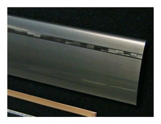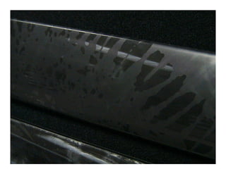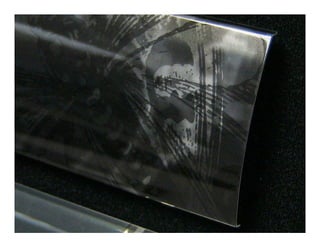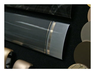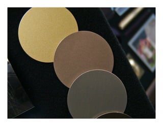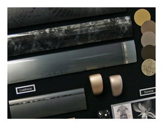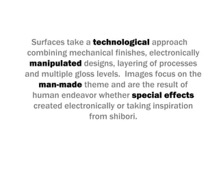 The document describes a technological approach to aluminum finishes through mechanical processes, electronically manipulated designs, and variations in gloss levels. It emphasizes a man-made theme inspired by special effects and shibori, presenting mood boards that highlight color and texture trends. The finishes are intended to serve as inspiration for trim or nameplate applications.