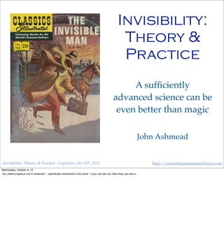 The document discusses the concept of invisibility and its historical and practical implications, including references to literature and scientific theories. It explores materials, mimicry in nature, and the evolution of camouflage techniques from World War I. Overall, it highlights the intersection of science and imagination in the pursuit of invisibility.