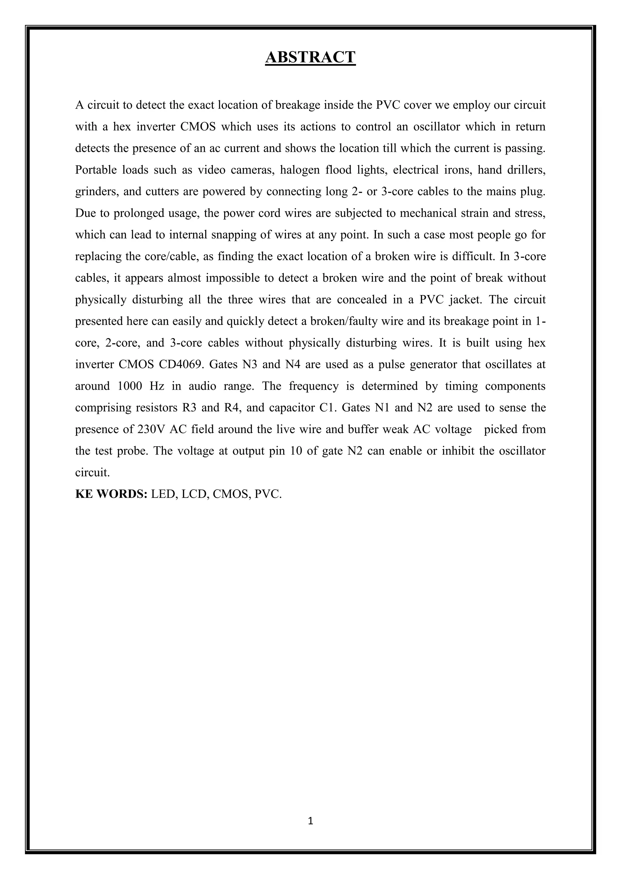 The document presents a circuit designed to detect the exact location of breakage in PVC-covered power cords, utilizing a hex inverter CMOS CD4069. This device enables contactless detection of faulty wires in 1-core, 2-core, and 3-core cables without physical disturbance, thus avoiding unnecessary replacements. The circuit is compact, portable, cost-effective, and operates with low power requirements, making it advantageous for users in various electronic applications.