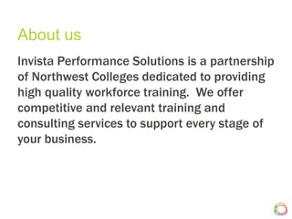 Invista Performance Solutions is a partnership of Northwest Colleges that provides workforce training and consulting services to support businesses. Its mission is to help companies gain a competitive advantage through focused training that increases employee skills. The partnership was formed at the request of local economic development groups to provide a single point of contact for workforce development, centralized coordination of services, and increased business satisfaction. Invista aims to serve as a one-stop organization for businesses' training needs through a professional team committed to client service and program evaluation.