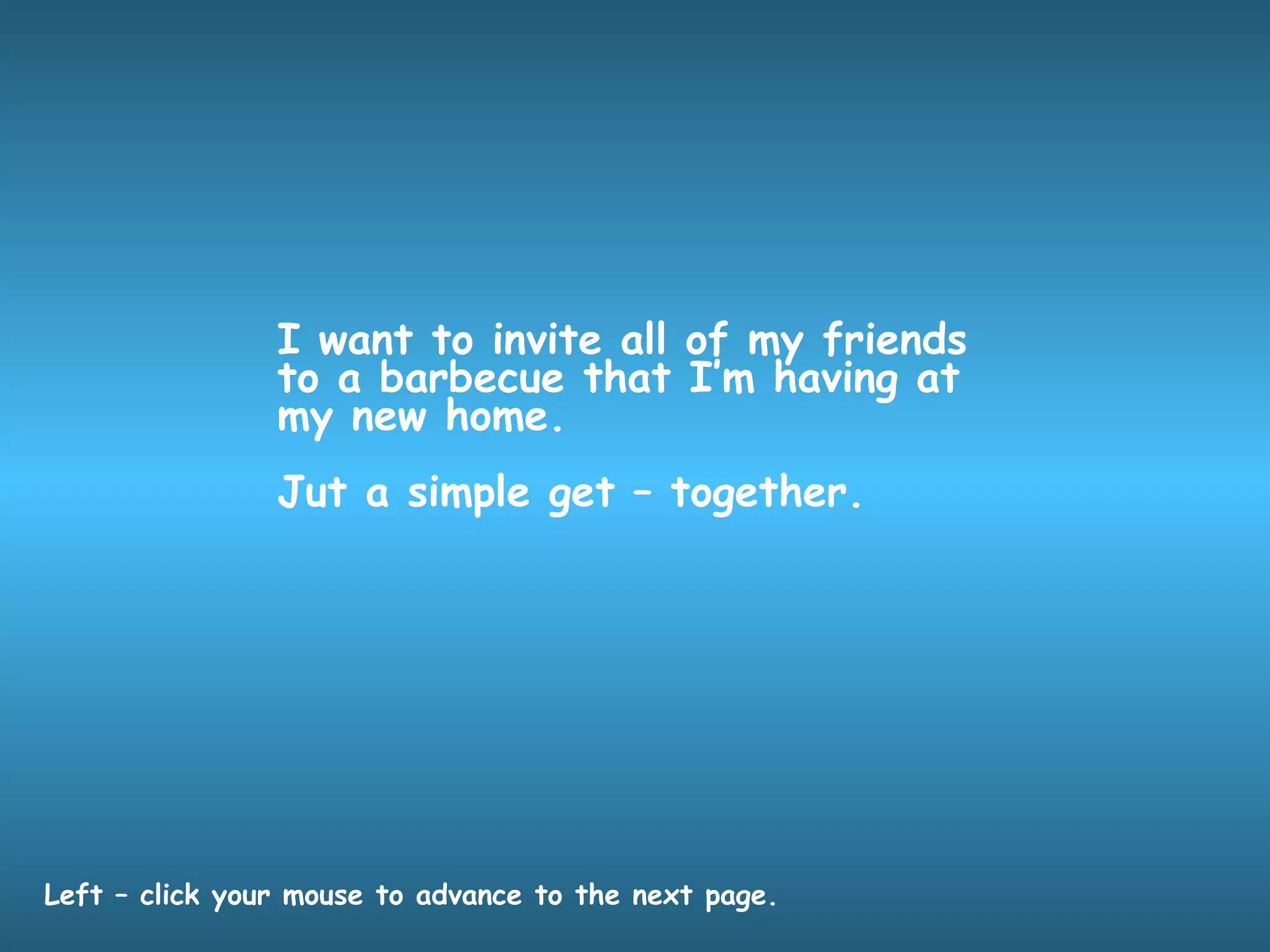 The document is an invitation from the host to friends for a barbecue at their new home, describing it as a simple get-together. The host wants to invite all their friends to a barbecue at their new home, keeping it casual.