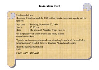 Andi invites his friend Budi to his 17th birthday party taking place on November 22, 2014 at 3pm at Andi's house on Jl. Warakas V gg. 1 no. 73. Through a conversation, Andi informs Budi about the event and Budi expresses his willingness to attend. The formal invitation letter provides further details about the birthday celebration and requests a response from guests.