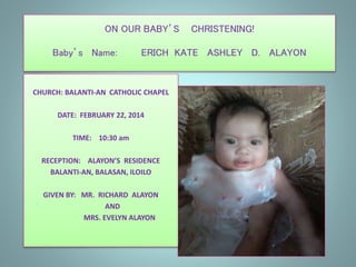 Erich Kate Ashley D. Alayon was christened on February 22, 2014 at 10:30am at Balanti-an Catholic Chapel. The reception was held at the Alayon residence.