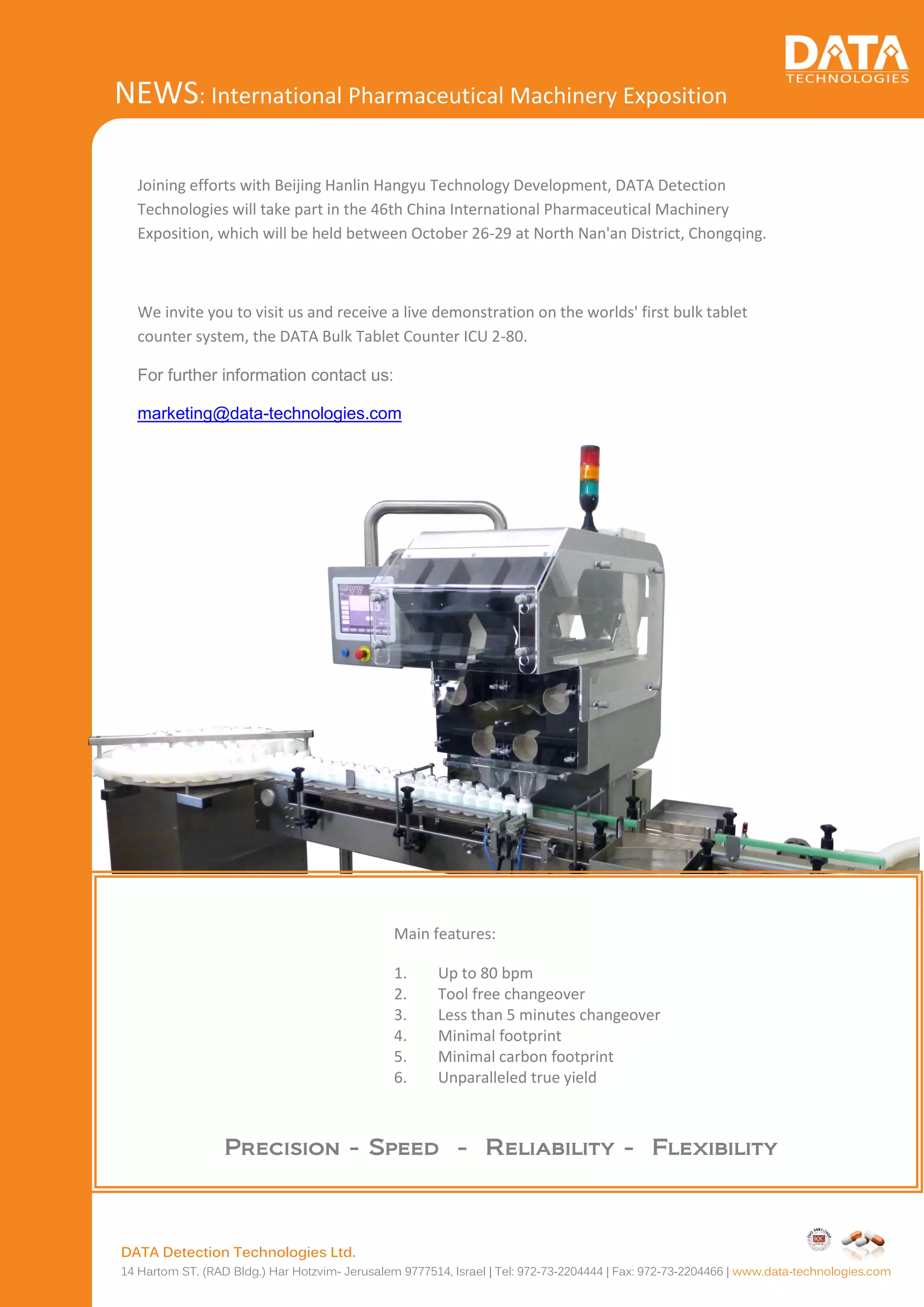 Data Detection Technologies will participate in the 46th China International Pharmaceutical Machinery Exposition from October 26-29 in Chongqing, showcasing their innovative bulk tablet counter system, the ICU 2-80. The system features fast changeovers, minimal footprint, and high precision in counting. For more details, interested parties are encouraged to contact marketing@data-technologies.com.