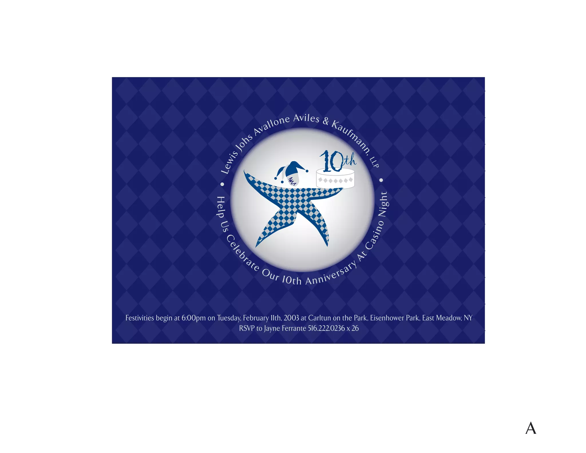 The document announces a 10th anniversary celebration beginning at 6:00pm on February 11th, 2003 at Carltun on the Park in Eisenhower Park, East Meadow, NY. Attendees are asked to RSVP to Jayne Ferrante at a provided phone number.