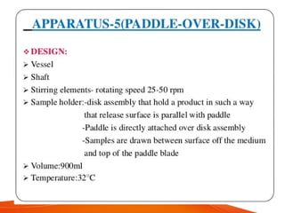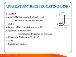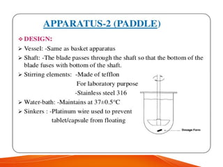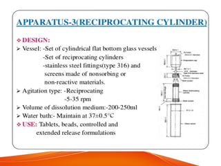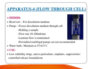The document discusses invitro dissolution testing of drugs. It defines dissolution rate and invitro dissolution tests as tests used to measure the rate and extent of dissolution of a drug from its formulation under specified conditions. Key factors in designing dissolution tests include the apparatus used, dissolution medium properties, and process parameters. Common apparatuses include basket, paddle, reciprocating cylinder, and flow-through cell methods. Dissolution testing provides important information on a drug's in vivo performance and quality control.