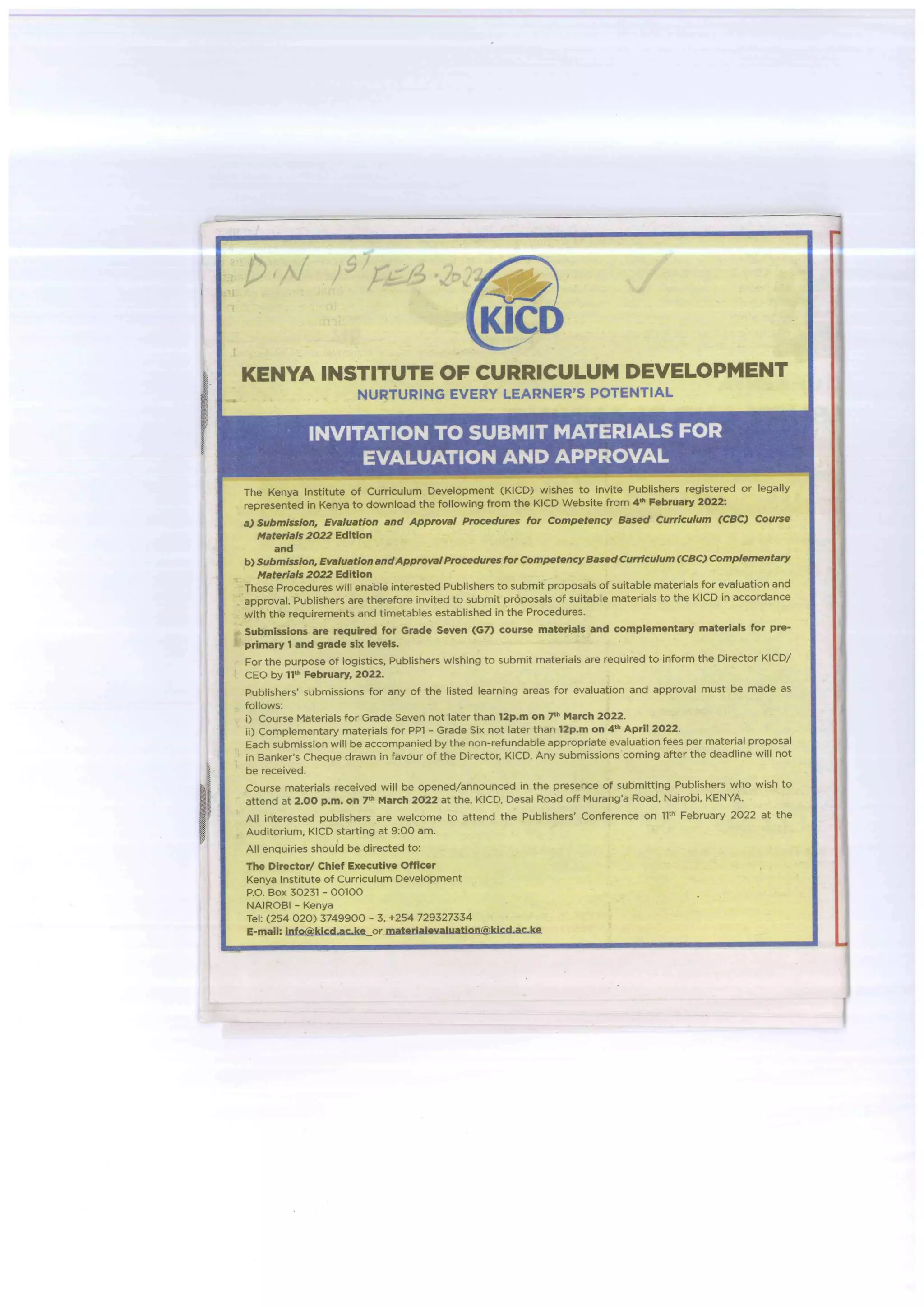 KICD advert in daily nation of 1st February 2022