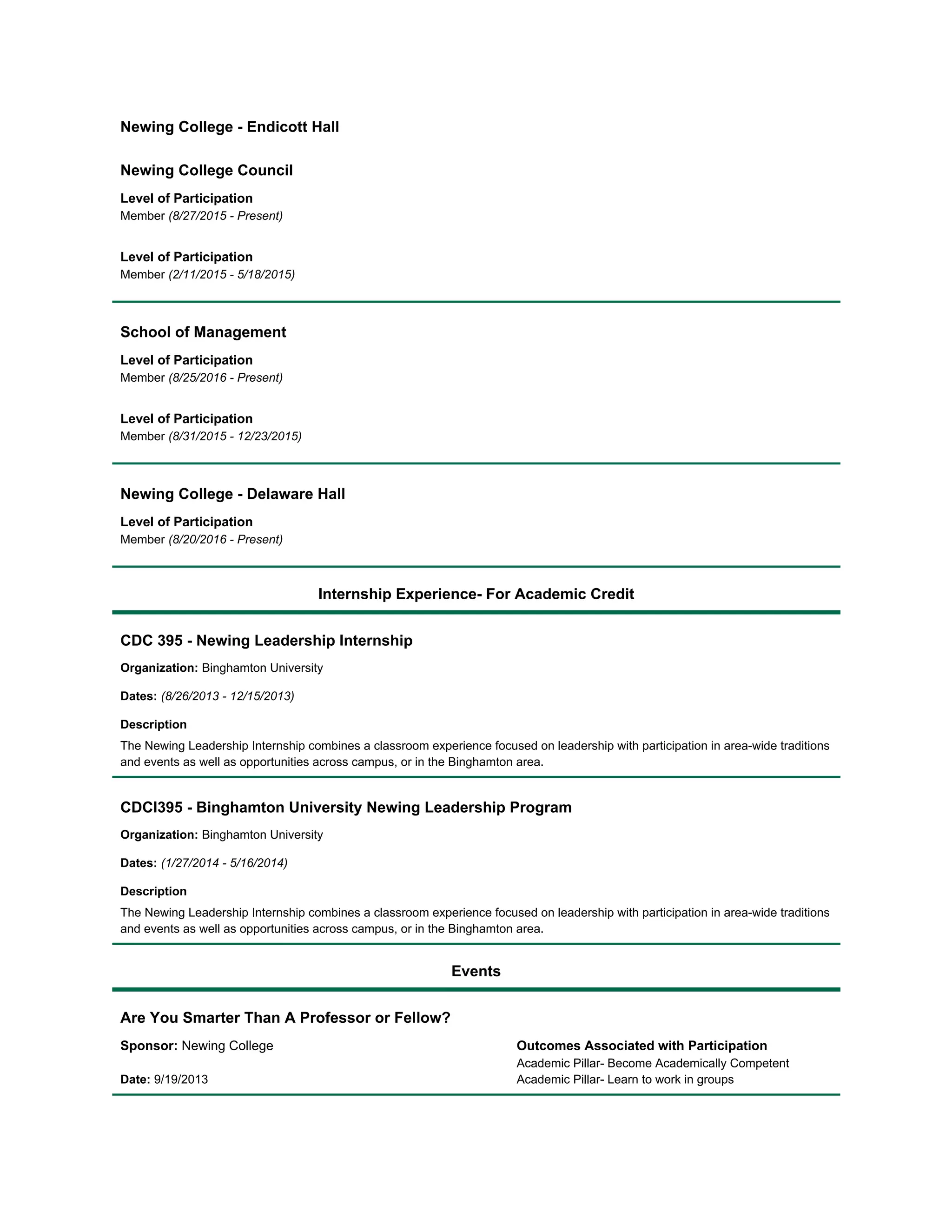 This document summarizes a student's involvement in campus organizations and activities at Binghamton University. It details the student's participation in various clubs and programs, including the Finance Society, Newing College, Newing College Council, and the School of Management. The student held leadership roles such as a Newing Leadership Internship and serving as a Student Conduct Board Member. The record is intended to complement the student's academic transcript and resume for applications and advising.