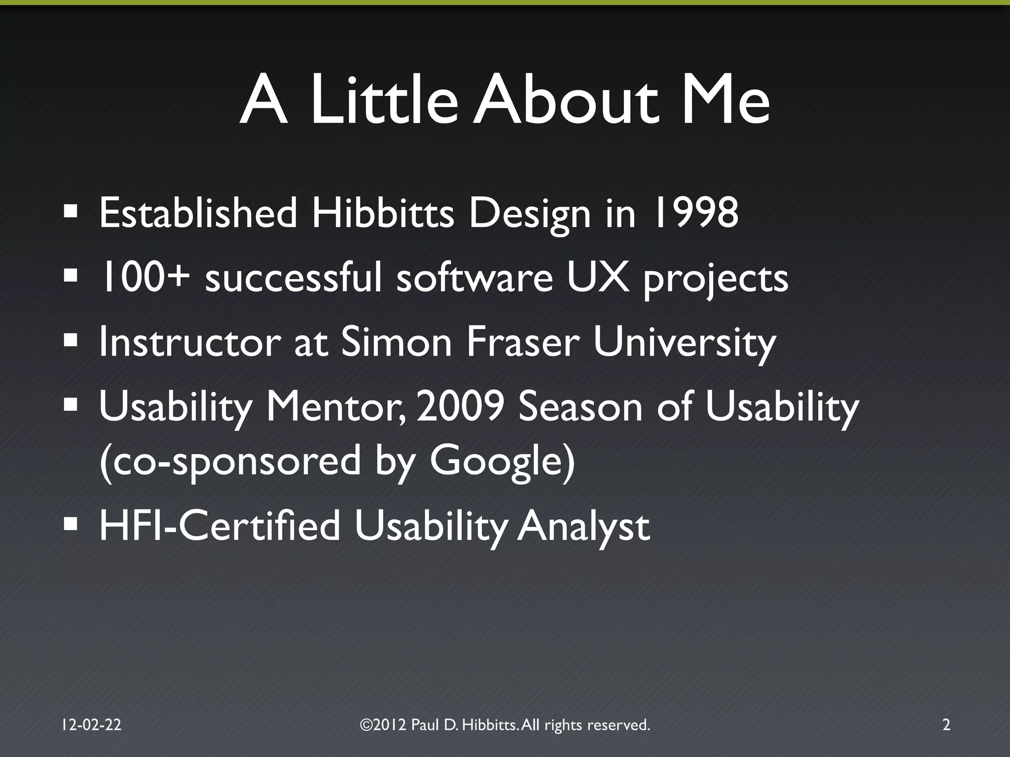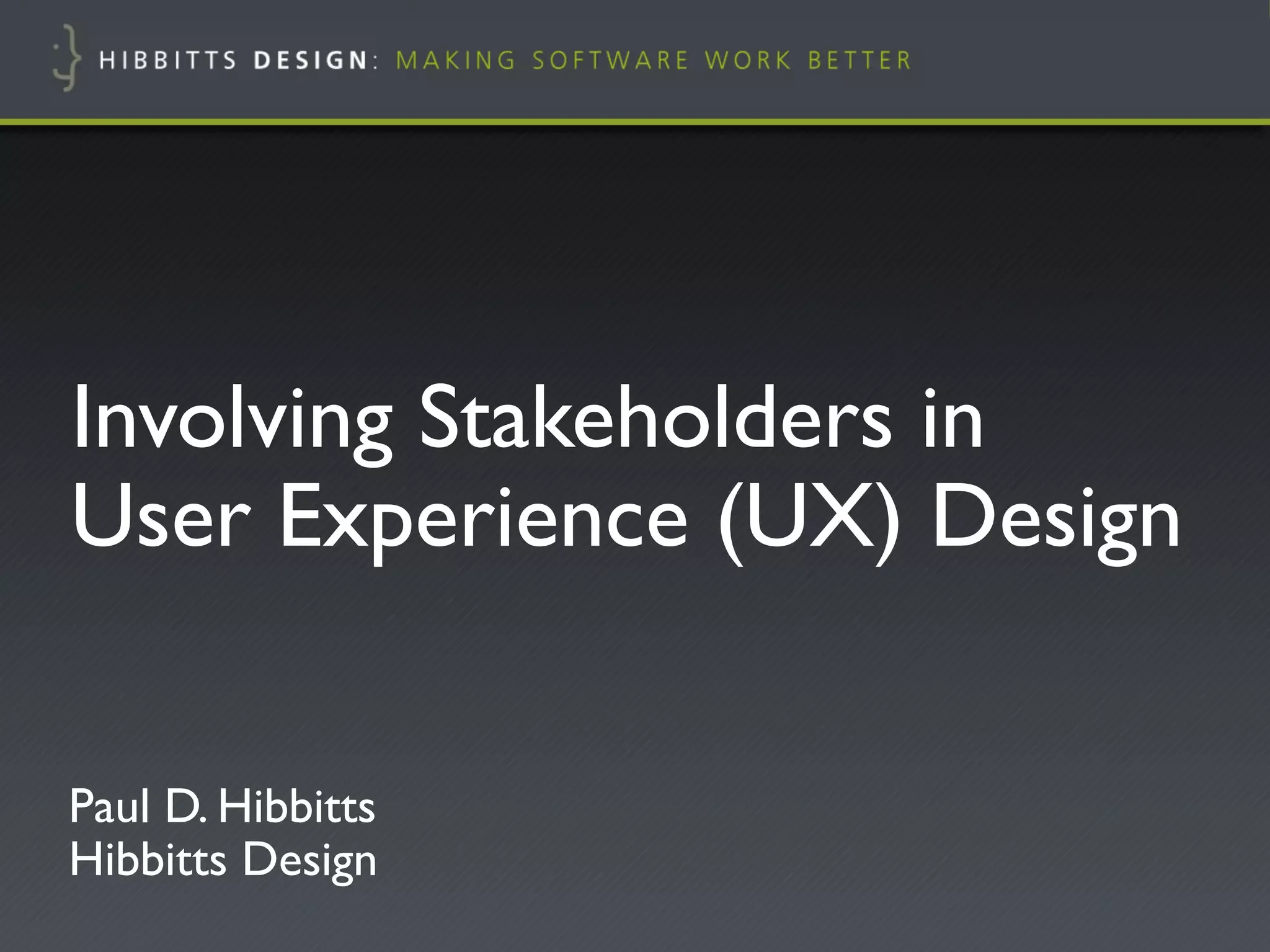 The document discusses the importance of involving stakeholders in user experience (UX) design processes, outlining four main methods: establishing usability goals, creating design scenarios, conducting stakeholder design reviews, and maintaining clear communication with stakeholders. It highlights practical strategies for collaboration and feedback, emphasizing empathy and understanding stakeholder perspectives as key elements for successful UX outcomes. The author, Paul D. Hibbitts, is an experienced UX professional with over 100 successful projects and a background in usability mentoring.
