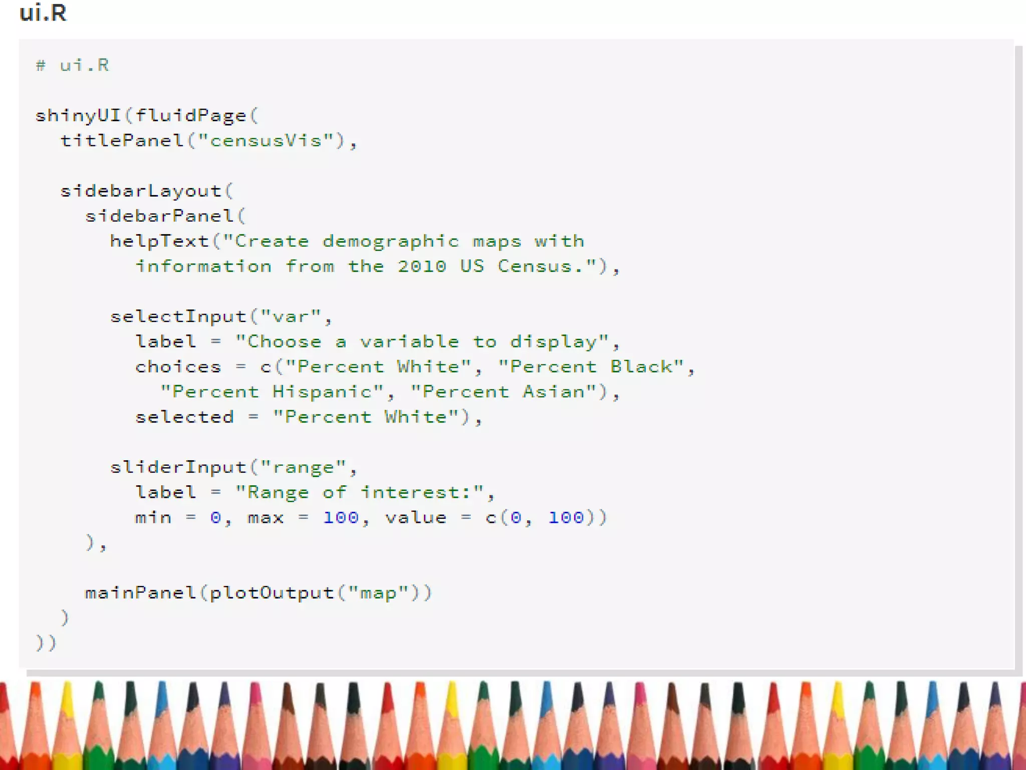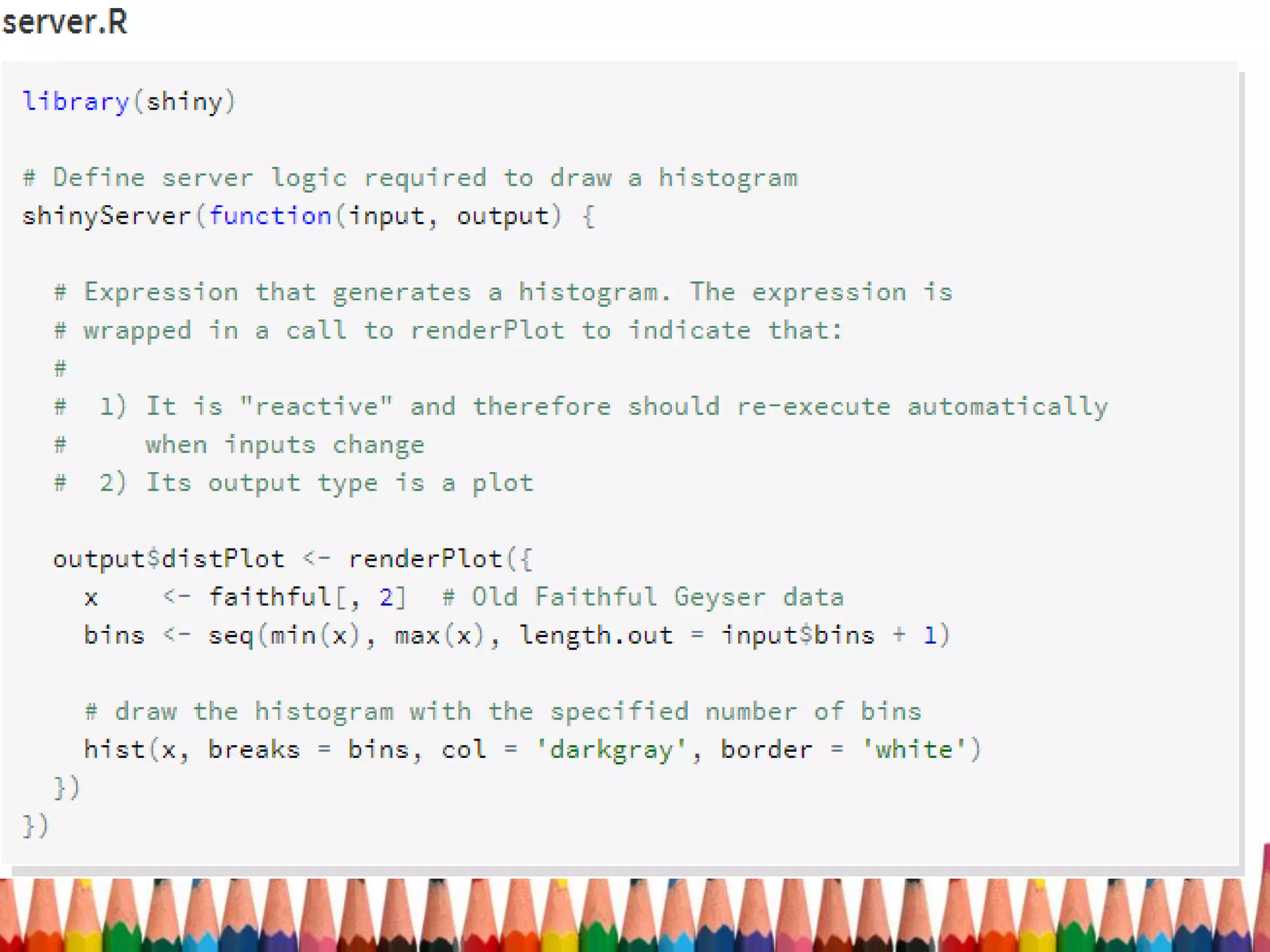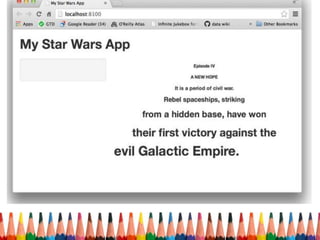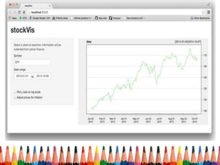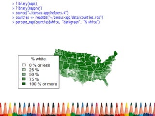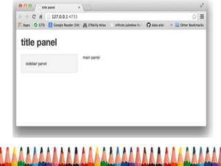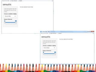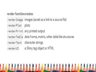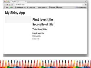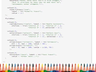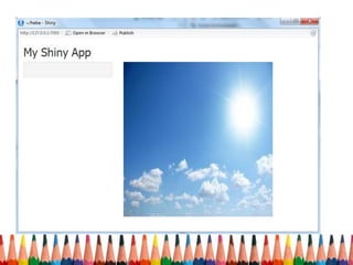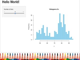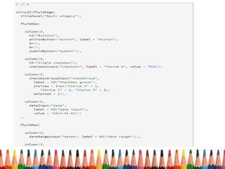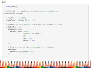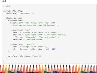 This document provides an overview and lessons on building interactive web applications with the Shiny package in R. It discusses the structure of Shiny apps which have two components - a user interface script (ui.R) and a server script (server.R). The ui.R controls the layout and appearance, while server.R contains the code to build the app. It also demonstrates how to add control widgets, display reactive output where the code is wrapped in render functions, and use R scripts and data in Shiny apps. Examples are provided to create histograms, add sliders and text outputs, and build a census app that visualizes US county data on a choropleth map.