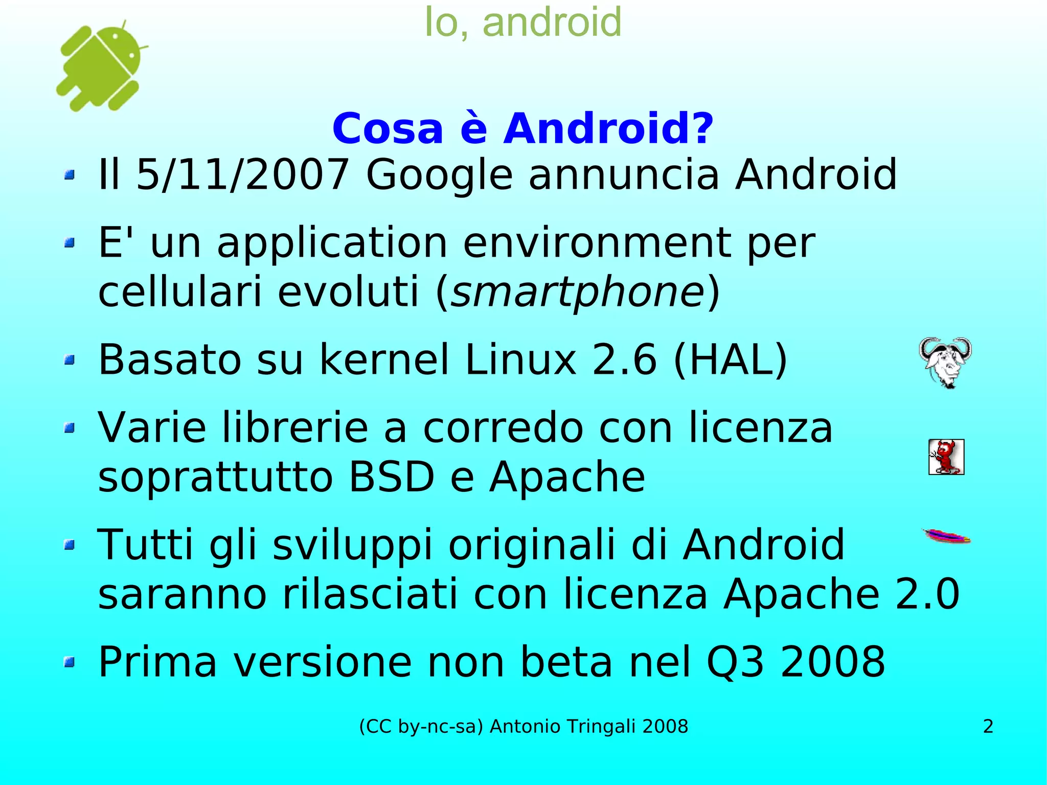 Il documento presenta Android, un ambiente per applicazioni mobili annunciato da Google nel 2007, basato su un kernel Linux e progettato per smartphone. Esamina la sua architettura, i componenti software come Dalvik e l'emulatore, oltre alle strategie di mercato e agli sviluppi futuri previsti per la telefonia mobile. Android cerca di ricreare il successo del mercato dei PC negli anni '90, con un rischio di riduzione nei costi e un focus sull'accesso a Internet.