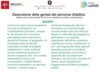 Il documento descrive un percorso didattico sull'argomento del cambiamento climatico per alunni delle classi 1^ e 2^ dell’IC 'F. Ferrucci', con attività dedicate a diversi aspetti come l'impronta ecologica e la sostenibilità. Le unità didattiche comprendono riflessioni sulla criticità degli sprechi energetici e l'impatto dei cambiamenti climatici, culminando in una simulazione di progettazione di una città ecosostenibile. Il progetto ha rafforzato le competenze disciplinari e civiche degli alunni attraverso metodologie attive e coinvolgenti.