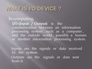 The document discusses input and output devices in computing, highlighting their roles in communication between computers and the outside world. It outlines various input devices like keyboards, mice, joysticks, and scanners, and explains output devices such as monitors, printers, and speakers. Additionally, it covers the evolution and characteristics of these devices, providing insights into their functionalities and usage.