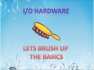 The document discusses input/output (I/O) processing and the role of the operating system in managing I/O operations and devices. It covers I/O hardware components like ports, buses, and controllers. It also describes the different models for interaction between I/O controllers and CPUs, including polling, interrupts, and direct memory access (DMA). Finally, it discusses I/O application interfaces and blocking vs non-blocking I/O.