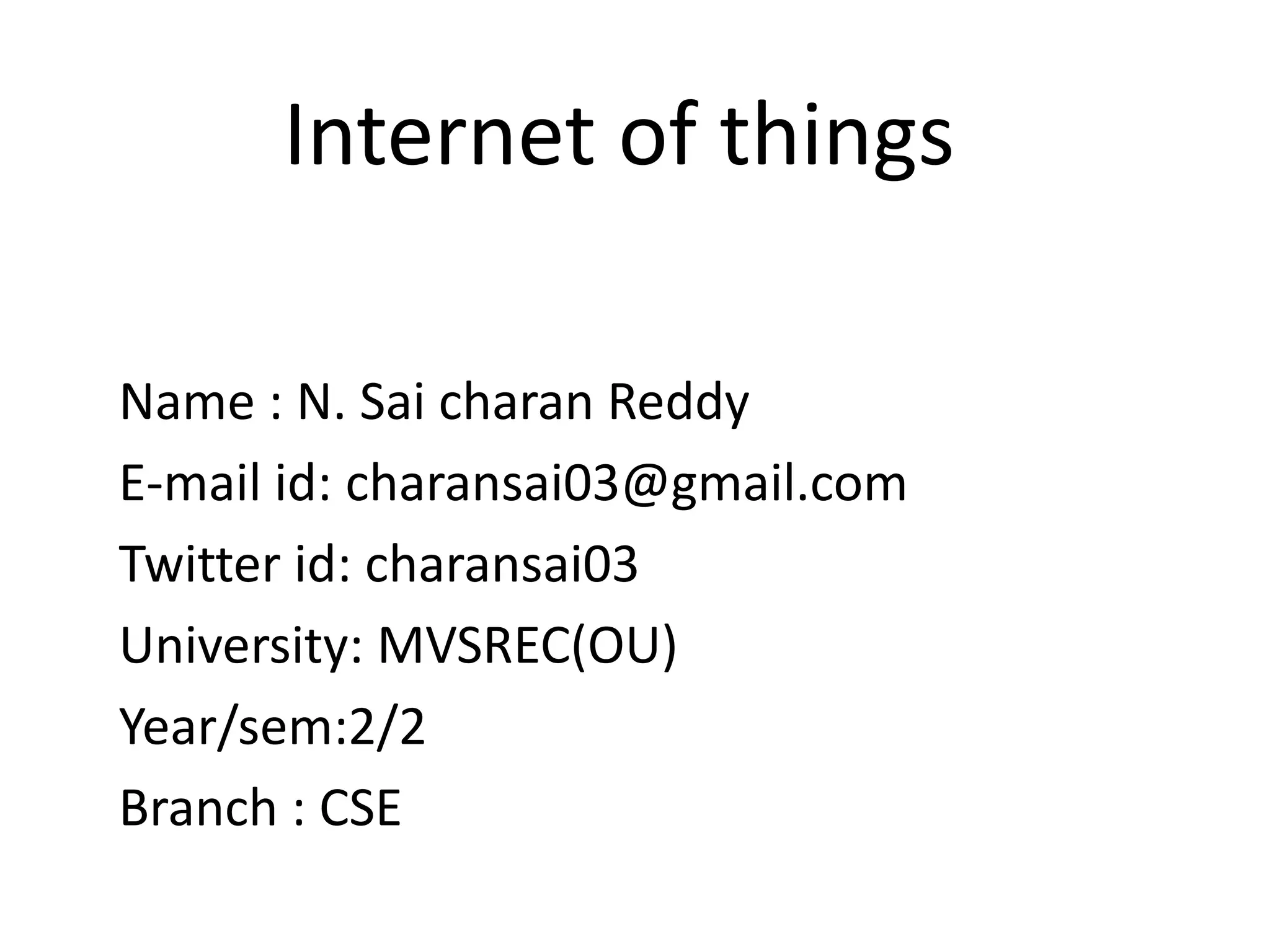 N. Sai Charan Reddy is a second year CSE student at MVSREC(OU) who is interested in internet of things. The document discusses internet of things, trends in IoT such as increased usage in food, management, education, retail and logistics, and a prediction of approximately 6 connected devices per person in the next 5 years. It also describes interest areas like transportation systems where sensors in vehicles can interact with surroundings to provide updates to drivers and automatically activate braking and warning systems based on driving conditions.