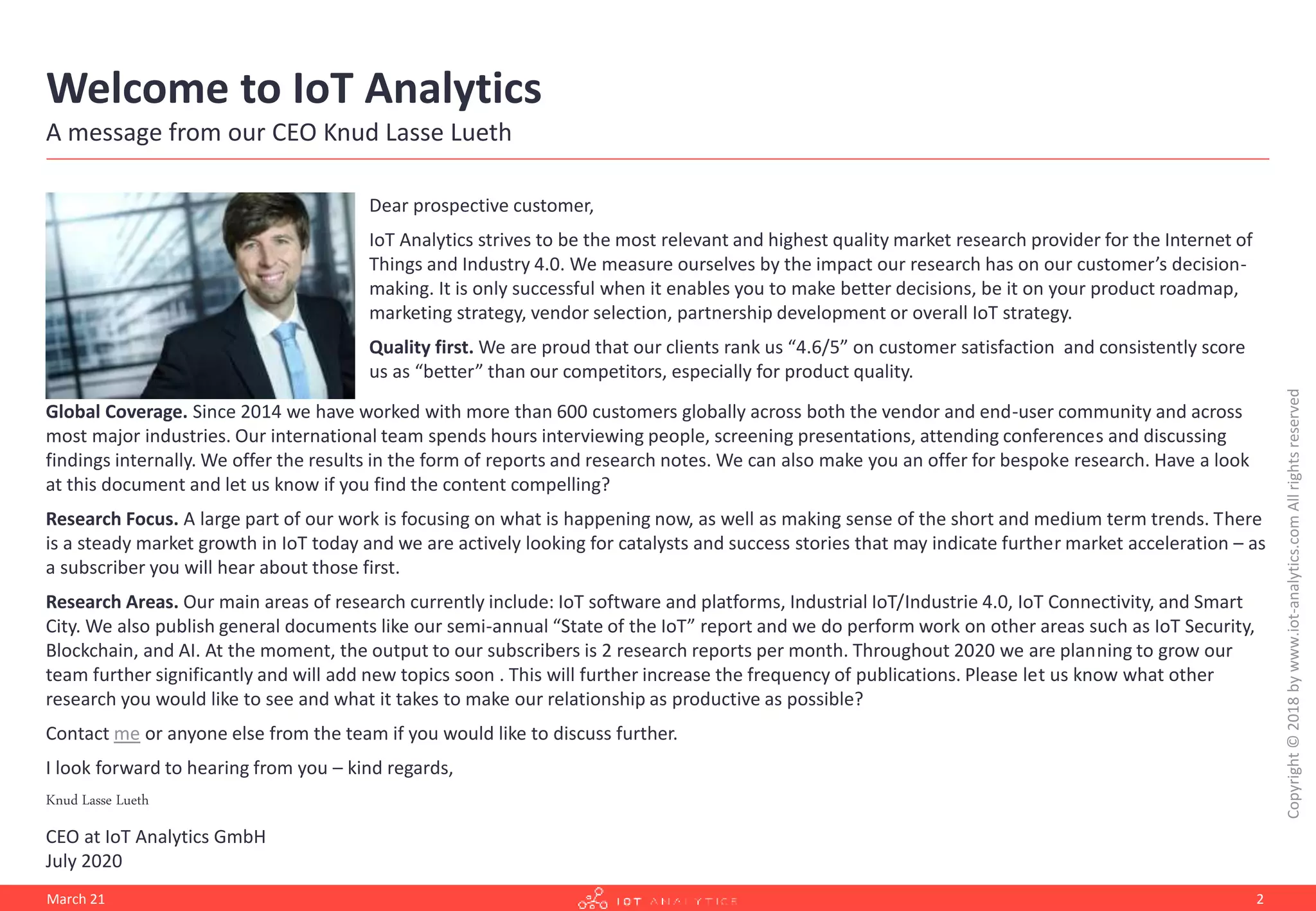 IoT Analytics is a market research provider focused on the Internet of Things and Industry 4.0, emphasizing quality and customer satisfaction, rated 4.6/5 by clients. Since 2014, they have delivered extensive reports and consulting services to over 600 global customers, with a research focus on current trends and significant growth in the IoT market. They offer a subscription service providing access to exclusive content, research reports, and insights tailored for customer needs.