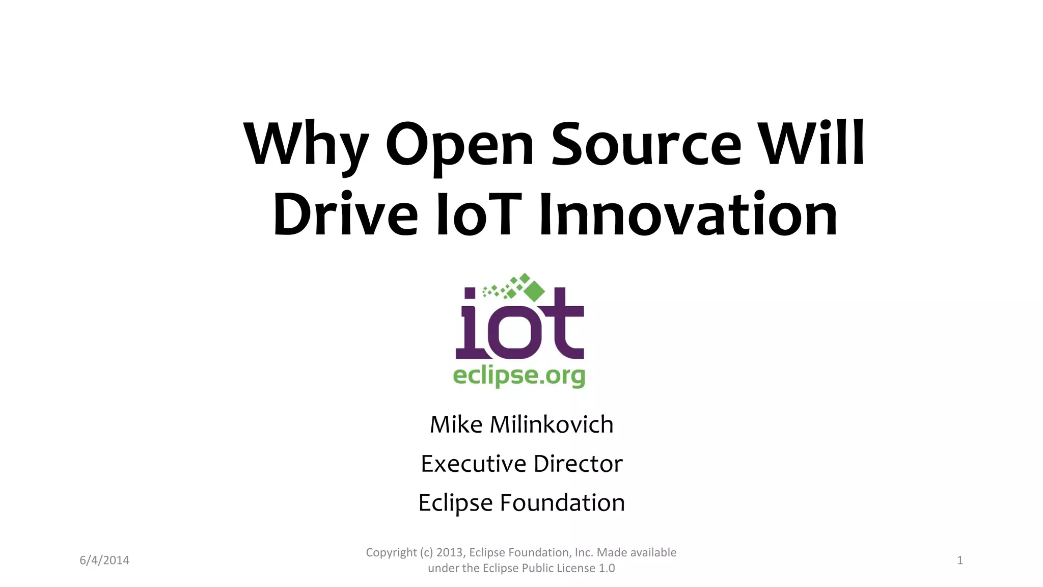 The document discusses how open source will drive innovation in the Internet of Things (IoT) space. It notes that the current IoT ecosystem is complex with different vendors and technologies. However, an open source approach using open protocols, frameworks, and development tools can help create a larger third-party ecosystem and encourage more developers to build applications, helping drive further innovation. The Eclipse Foundation is working on several open source IoT projects to help establish open standards and an open development environment for IoT.