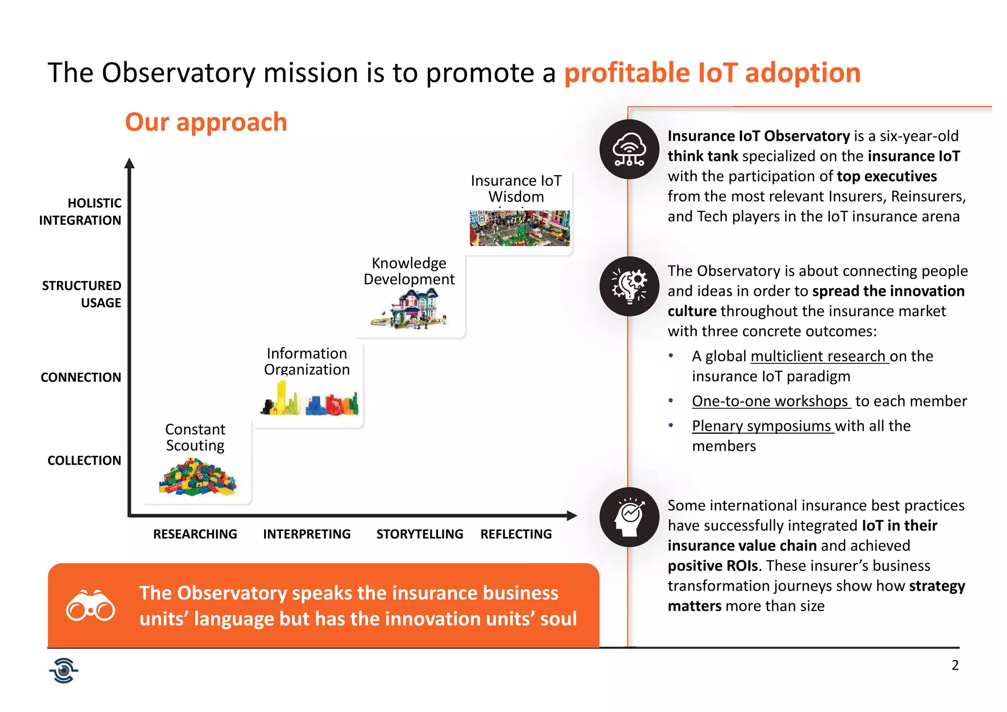 The IoT Insurance Observatory is a think tank focused on promoting IoT adoption in the insurance sector, involving collaboration between top industry executives. It provides members with access to research, workshops, and symposiums, aiming to enhance business strategies through IoT innovations that improve customer experience and operational efficiency. The observatory also facilitates discussions on best practices and challenges in implementing IoT solutions across various insurance lines globally.
