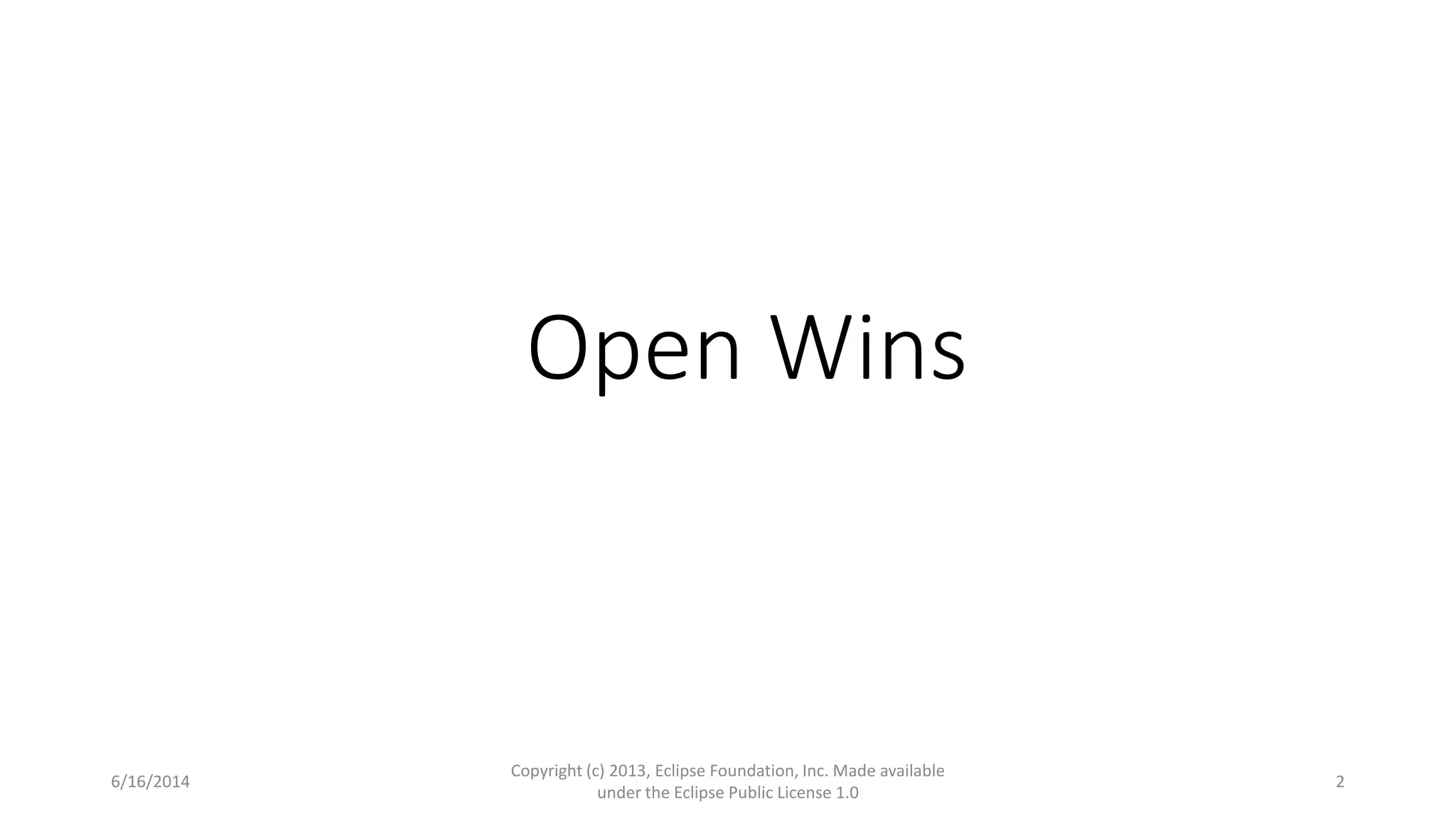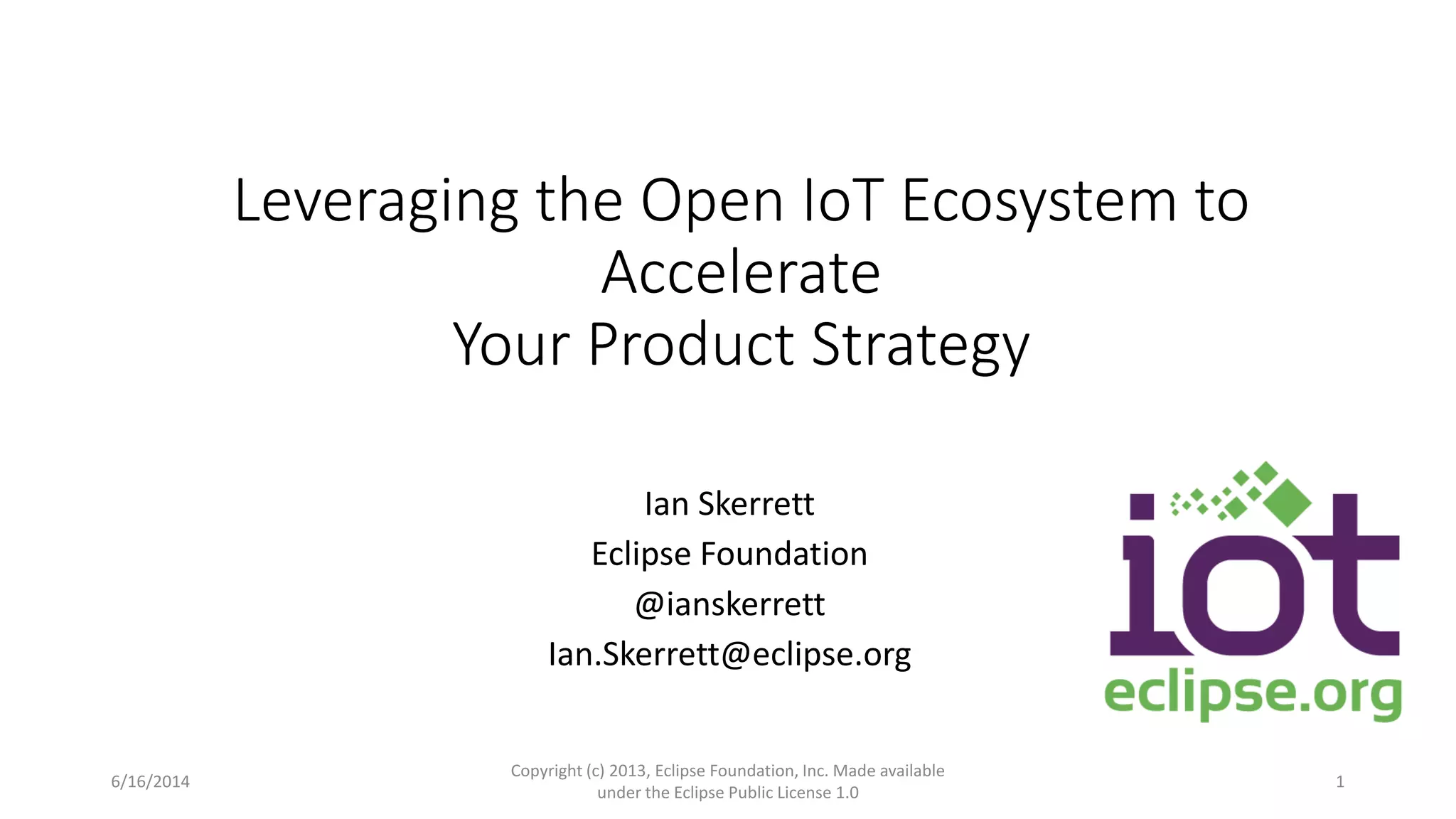 The document discusses leveraging open source technologies to accelerate product strategies for Internet of Things (IoT) projects. It advocates embracing open IoT standards to access a larger ecosystem, using open hardware to lower barriers to entry, and participating in open source software projects to build larger ecosystems and lower costs. The Eclipse Foundation is presented as a resource for open IoT projects through its IoT working group and projects that provide open protocols, frameworks, and tools to connect, manage and develop IoT solutions.