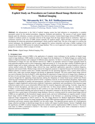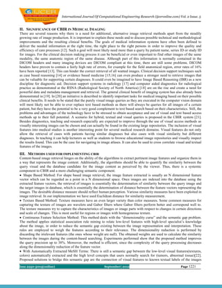 This document summarizes recent work on content-based image retrieval (CBIR) techniques for medical images. It discusses several methods used for CBIR, including shape-based, texture-based, and feature selection methods. Recent CBIR works are surveyed that use approaches like support vector machines, nearest neighbor algorithms, and relevance feedback. While progress has been made, the document notes there are still research gaps around bridging the semantic gap between low-level image features and high-level concepts, and improving retrieval accuracy and efficiency.