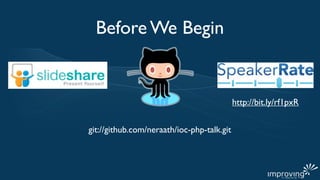 The document discusses using inversion of control (IoC) and dependency injection (DI) to decouple classes and make them more flexible and testable in PHP. It provides an example of refactoring an authenticator class to depend on a user repository interface rather than a concrete class. This decreases coupling and allows different repositories to be injected. It then discusses using a service container to further abstract object creation and injection of dependencies defined through code or configuration.