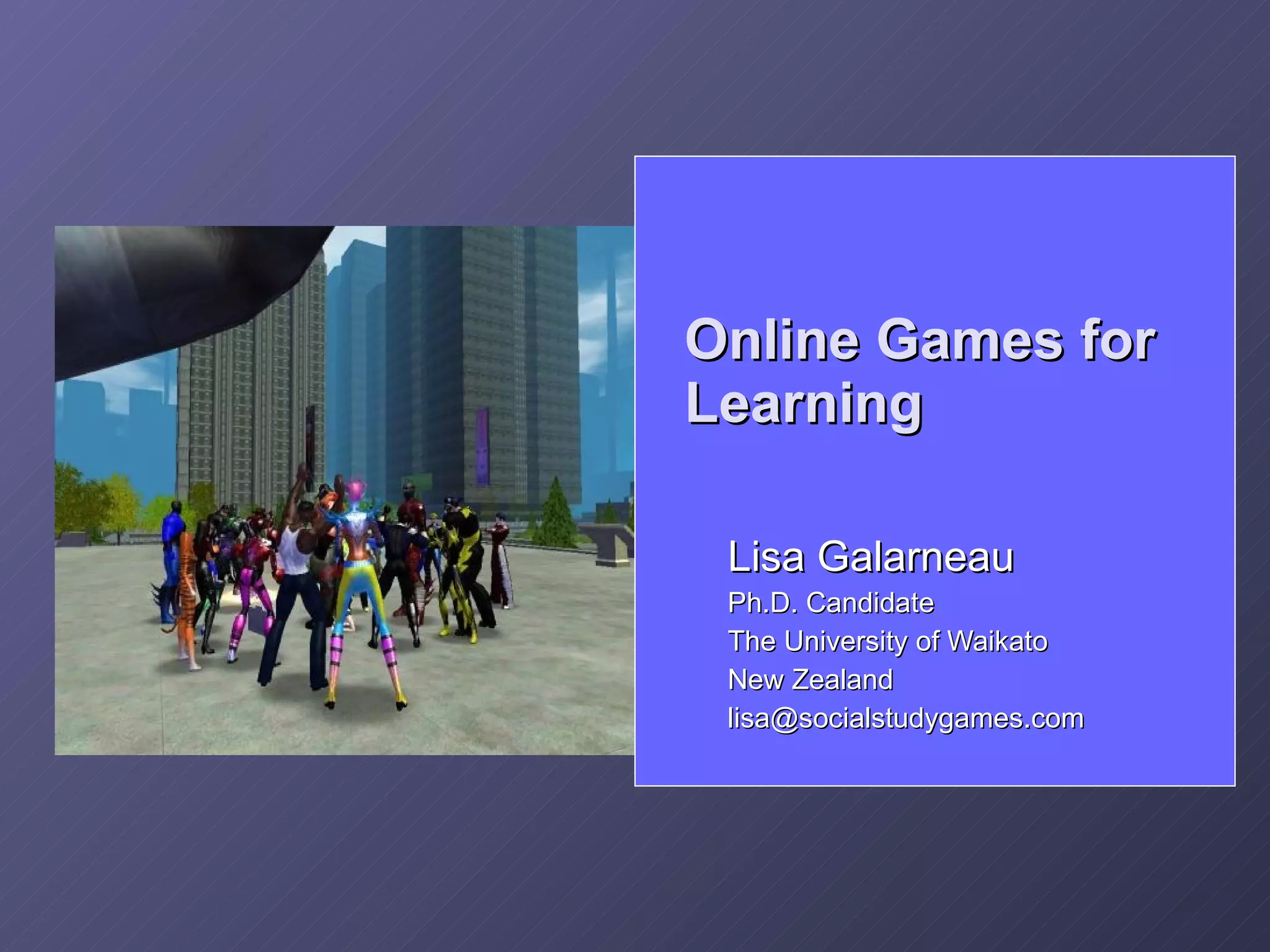 The document discusses how online games can be used for learning. It argues that games facilitate the development of 21st century skills like problem-solving, decision-making, teamwork and communication. Specifically, social play in games is good for learning as people often learn without meaning to in social contexts. While games are often played for fun, they provide opportunities for informal learning of important skills. The document suggests online games and virtual worlds could become mainstream platforms for learning.