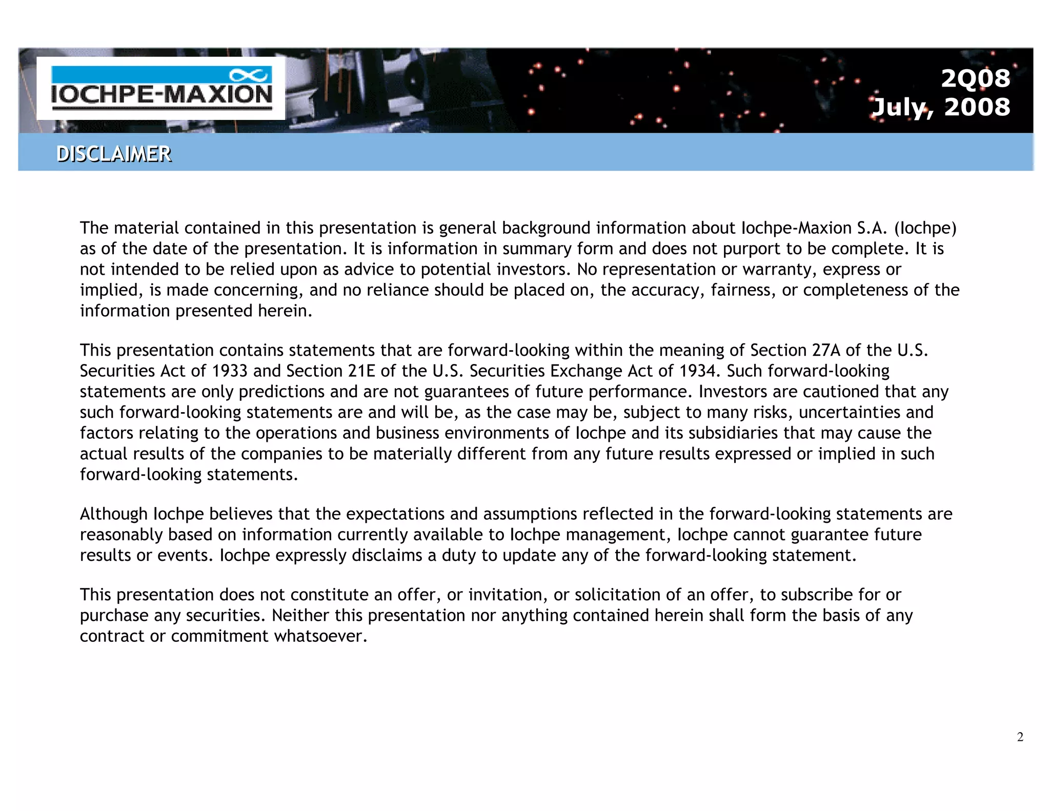 - Iochpe-Maxion reported consolidated net operating revenue of R$442.1 million for 2Q08, an increase of 38.6% over 2Q07.