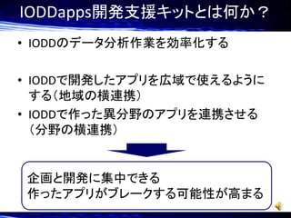 IODDapps開発支援キットとは何か? • IODDのデータ分析作業を効率化する • IODDで開発したアプリを広域で使えるように する(地域の横連携) •