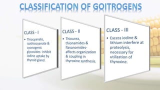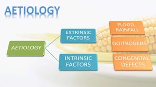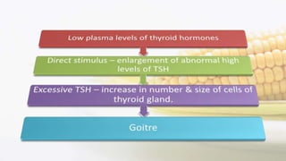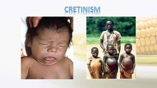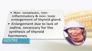 Iodine is an essential trace element necessary for thyroid hormone synthesis and plays a crucial role in brain development and metabolic regulation. Iodine deficiency disorders (IDD) affect 1.5 billion people globally, leading to severe health issues such as goiter, cretinism, and mental impairment. The document highlights dietary sources, recommended intake levels, cooking methods that affect iodine content, and the importance of addressing iodine deficiency as a major public health concern.