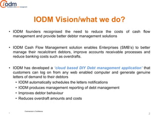 This document summarizes a new debt management service called IODM that helps businesses better manage accounts receivable and improve cash flow. IODM offers a cloud-based software that automatically generates demand letters to send to delinquent debtors. The software reduces debt collection times and costs compared to traditional methods through automated scheduling of letters and management reporting. IODM also has a strategic partnership with a large global debt collection firm to provide additional services if needed.