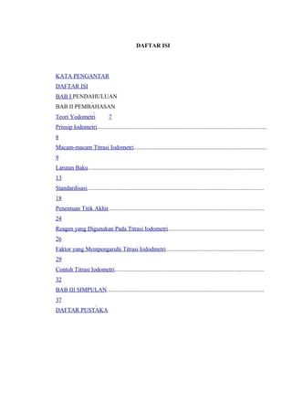 Makalah ini menguraikan metode iodometri dan iodimetri dalam analisis kuantitatif menggunakan titrasi, dengan penjelasan tentang pengertian, prinsip, dan variasi titrasi yang dapat dilakukan. Penulis juga menjelaskan reaksi yang terjadi antara ion iodida dan oksidator serta cara pembuatan dan standarisasi larutan baku iodium. Diharapkan makalah ini dapat bermanfaat dan memberikan pengetahuan tambahan kepada pembaca.