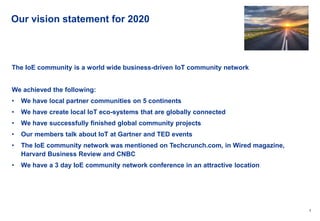The document outlines the vision, mission, values, goals and structure of the IoE Community Network, a global business-driven IoT community. The network aims to educate about IoT, understand how it can solve problems and create value, and bring diverse stakeholders together through local partner communities connected globally. Its goals for the first 12 months include growing membership to 1000+, completing 3 community projects, and launching collaboration and reference architecture platforms. The network provides benefits like access to experts, professional networking, and learning opportunities for members, sponsors and the IoT field overall.
