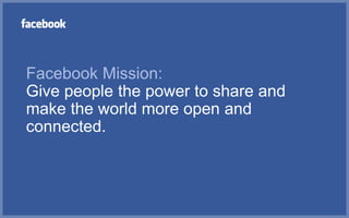 This document provides information about Facebook's mission and growth over time. It summarizes that Facebook's mission is to give people the power to share and make the world more open and connected. As of the date of the document, Facebook had over 500 million users worldwide across 70 different languages, with more than half of users returning daily and over 250 million mobile users each month. The document also provides tips for using Facebook pages and ads.