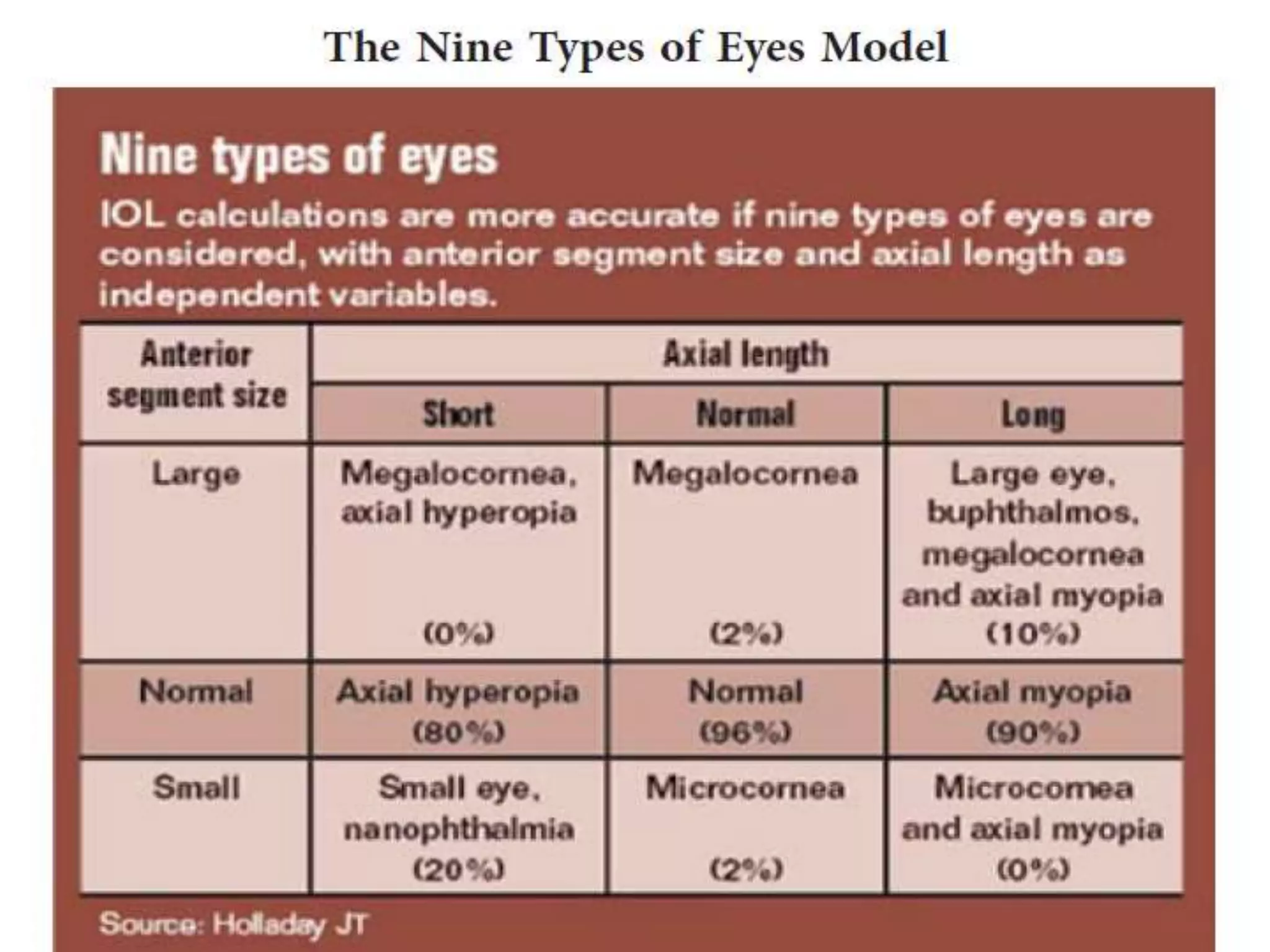 The document discusses various formulas used for calculating intraocular lens (IOL) power, including SRK, SRK2, Holladay, Haigis, and Holladay 2. It explains the factors these formulas account for such as axial length, corneal power, anterior chamber depth, and how they have evolved over generations to improve accuracy. Special considerations for calculating IOL power in cases involving prior refractive surgery, silicone oil filling, posterior staphyloma, and using optical biometry devices are also summarized.