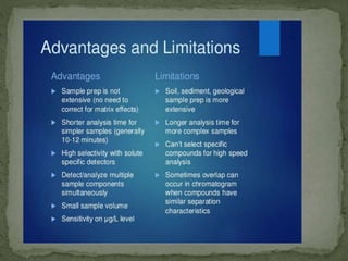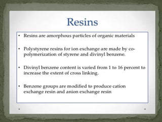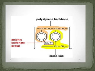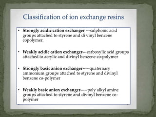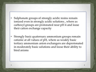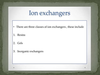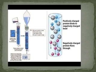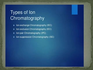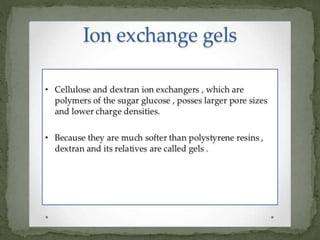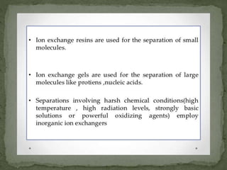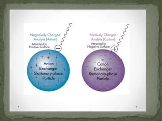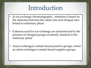 Ion-exchange chromatography separates molecules based on their charge through electrostatic interactions with an immobile matrix containing charged functional groups. It is utilized for applications such as deionization of water, purification of solutions, and separation of biomolecules and organic compounds. The technique is essential in clinical diagnostics and biochemical analysis for obtaining pure compounds.