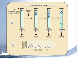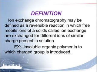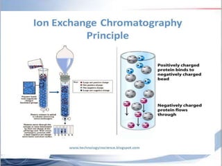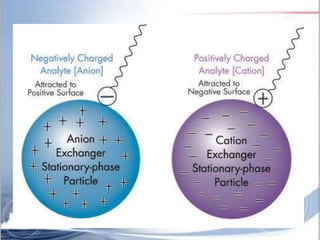 Ion exchange chromatography is a separation technique based on charge that can be used to separate a wide range of charged molecules like proteins, nucleotides, and amino acids. It works by exploiting ionic interactions between oppositely charged solute ions and the stationary phase. The stationary phase is typically a resin with covalently attached anions or cations. Cation exchange chromatography retains positively charged molecules, while anion exchange chromatography retains negatively charged molecules. Separation is achieved as molecules are differentially retained on and eluted off the column based on their affinity for the stationary phase. Ion exchange chromatography is widely used for applications like water softening, demineralization, and separation of molecules like amino acids, sugars, and lan
