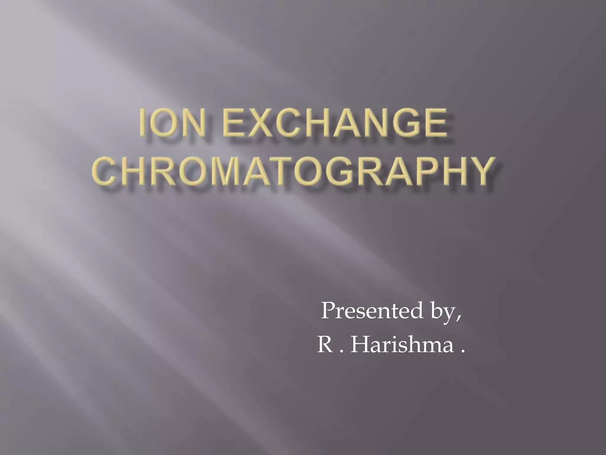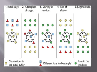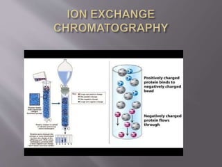 Ion exchange chromatography is a technique used to separate charged molecules based on their interaction with oppositely charged groups on a resin. It works by reversible exchange of ions between the ions in a sample and those on an ion exchange resin. There are two types of resins - cation exchange resins which interact with positively charged ions, and anion exchange resins which interact with negatively charged ions. The process involves equilibrating the resin, applying the sample, washing unbound molecules, and then eluting the bound molecules using an increasing salt gradient. Ion exchange chromatography is widely used to purify proteins and analyze ions in applications like biochemistry, water quality testing, and metal purification.