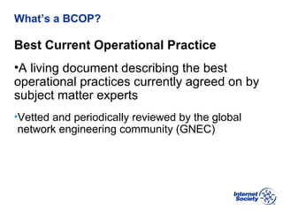 The document discusses Best Current Operational Practices (BCOP) as a community-driven initiative aimed at sharing vetted operational knowledge among network engineering professionals worldwide. It highlights ongoing BCOP activities across different regions, including the formation of task forces and the development of specific documents addressing various networking challenges. The initiative encourages participation from the global community to foster collaboration and ensure the dissemination of up-to-date operational practices.