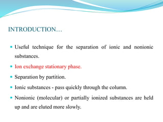 This document discusses ion exclusion chromatography, which uses an ion exchange stationary phase to separate ionic and nonionic substances. Ionic substances pass quickly through the column while nonionic substances are retained longer. Separation depends on whether substances are ionized and repelled by the resin or able to enter the resin network if nonpolar or partially ionized. Detection methods include conductivity detectors and UV-visible or fluorescence detectors. Applications include separation of carboxylic acids, inorganic anions, amino acids, and determination of water in organic solvents.