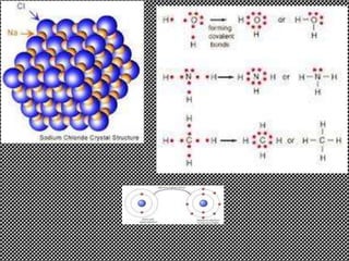 Ionic bonds form between oppositely charged ions through electrostatic attraction. The strength of ionic bonds increases with greater charge separation, resulting in higher melting points. Ionic solids do not conduct electricity. Covalent bonds form when atoms share pairs of electrons. Ionic and covalent bonding allow for the formation of stable chemical substances containing two or more atoms.