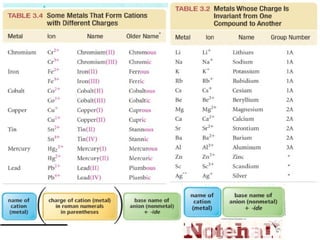 Ionic bonding occurs when atoms of metals and non-metals combine to form ionic compounds. Atoms of metals will donate electrons to form cations, while atoms of non-metals will accept electrons to form anions. This transfer of electrons allows the atoms to achieve stable electron configurations similar to noble gases. Common examples are sodium chloride, which forms when sodium donates an electron to chlorine, and magnesium oxide, which forms when magnesium donates two electrons to oxygen. The chemical formulas of ionic compounds are written to balance the charges of the cation and anion.