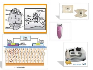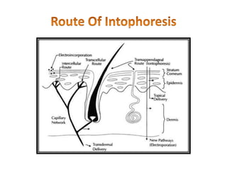 Iontophoresis is a technique that uses a low-level electrical current to introduce ions into the body across the skin. Positively or negatively charged drug ions are repelled into the skin by their respective electrodes. Factors like drug concentration, pH, charge, and molecular size influence transport. While it is a painless, sterile method for delivering certain charged drugs through the skin with small dosages, it also has drawbacks like potential irritation and device failures that require skilled operation. Iontophoresis has applications in areas like analgesia, wound healing, and inflammatory conditions.