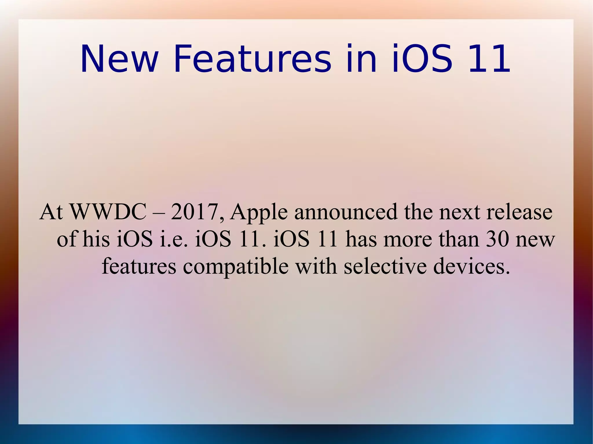 iOS 11, announced at WWDC 2017, introduces over 30 new features and is compatible with various devices, including iPhone 5s and newer. Key features include the end of 32-bit app support, improved mapping data through drones, a video sharing app, more natural Siri sounds, dark mode, and contact availability status. Additionally, iOS 11 implements an enhanced iCloud voicemail feature and includes a QR code reader for users in China.