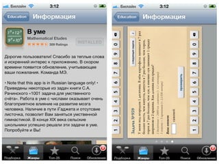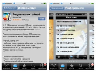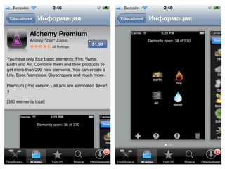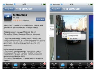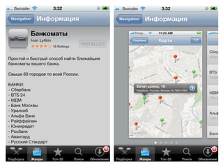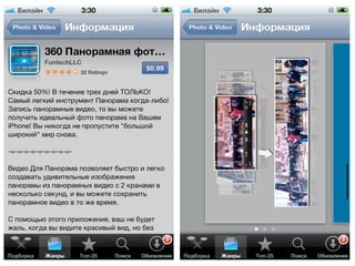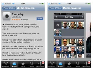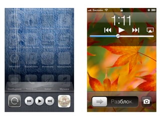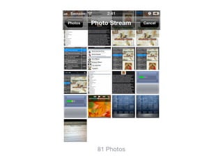 The document discusses various capabilities and features available to iOS applications, including determining internet connectivity, detecting WiFi or cellular network connection, accessing the device's accelerometer and gyroscope, determining device orientation, obtaining location data and compass heading, recording and playing audio and video, taking photos and videos with the camera, and more. It provides code examples for implementing many of these features.