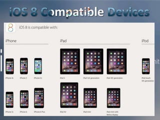 This document provides an overview of iOS, including its history, development tools, programming languages, and software layers. It discusses the Core OS layer, Core Services layer, Media layer, and Cocoa Touch layer that make up iOS. It also lists iOS devices and versions that have been released. Finally, it outlines some new features introduced in iOS 8 like QuickType keyboard, support for third-party keyboards, recent contacts in app switcher, HealthKit, and improved Spotlight search capabilities.